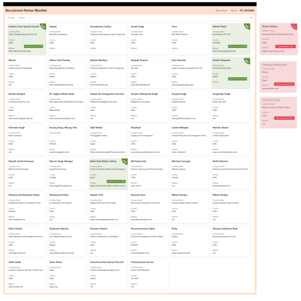 The below list consists of recruitment agents who are either no longer part of the ApplyBoard network and/or have been pre-emptively blocked from accessing the platform due to known infractions that were published publicly and/or submitted by a partner institution.