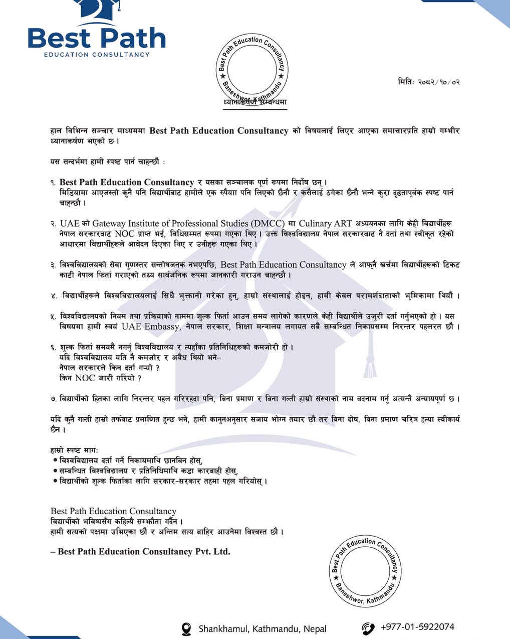 - We want to publicly inform you that after the service quality of the university was not satisfactory, Best Path Education Consultancy arranged for the students’ tickets at its own expense and brought them back to Nepal.